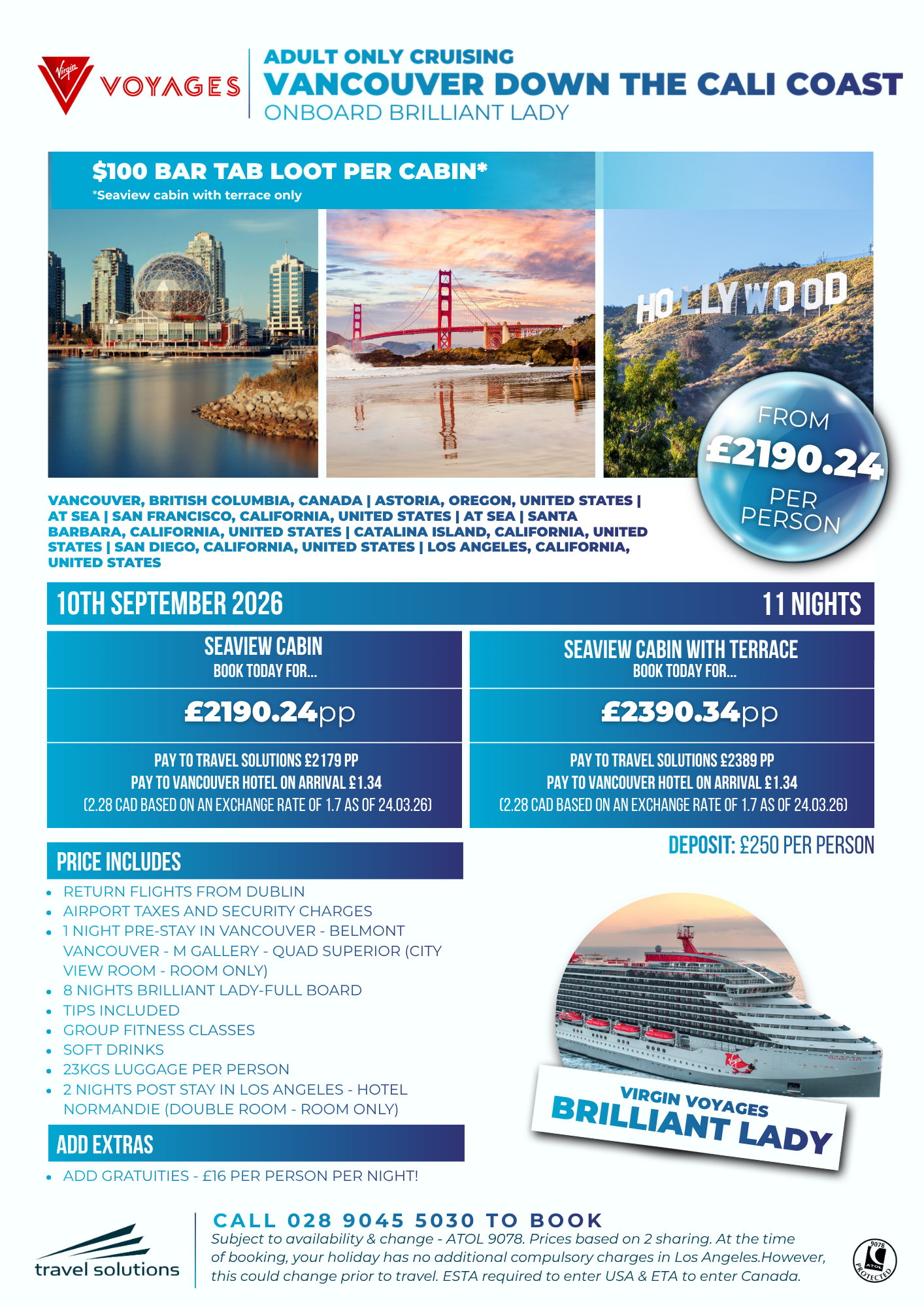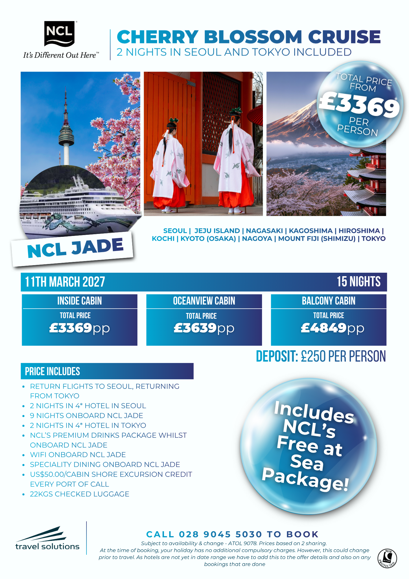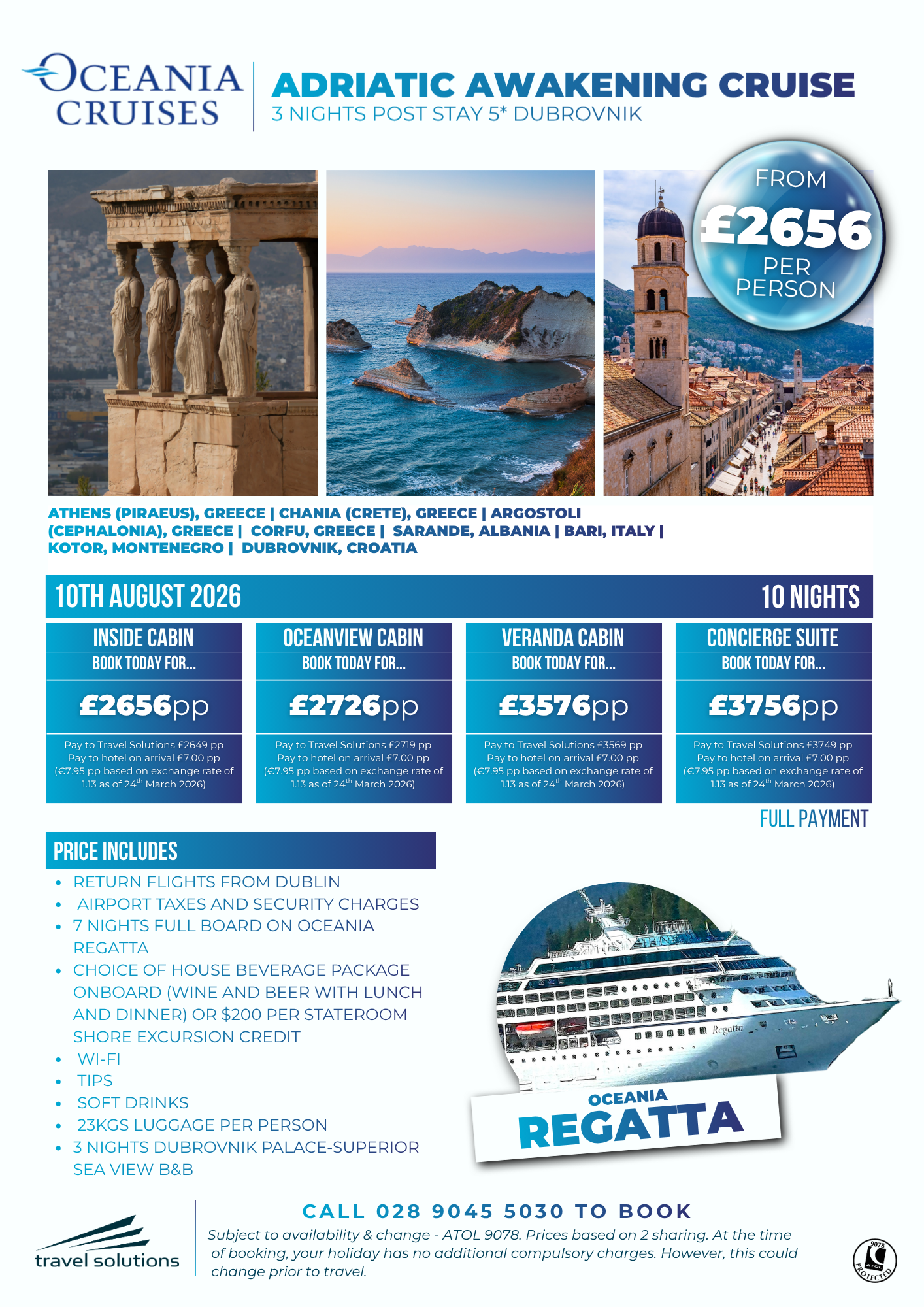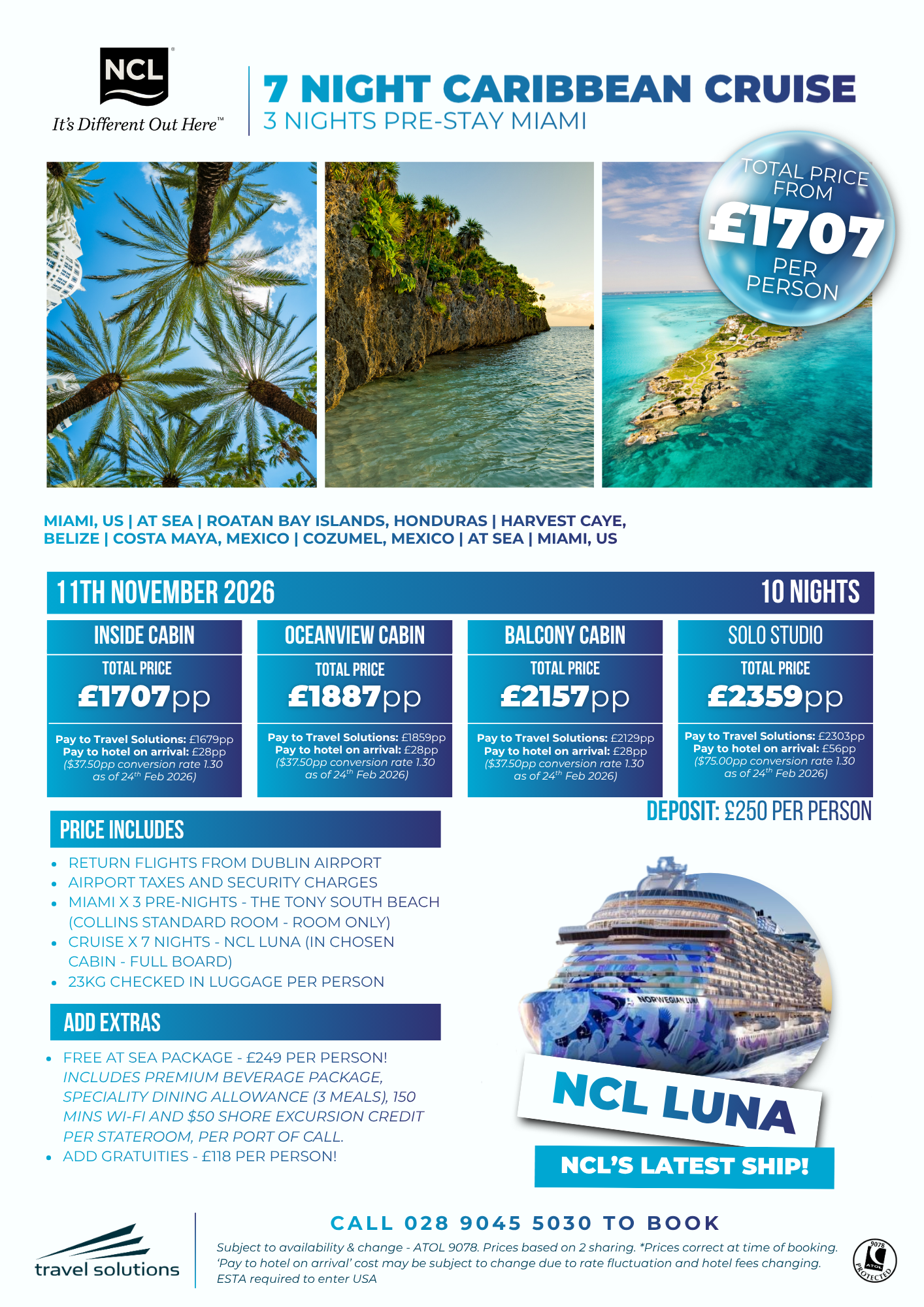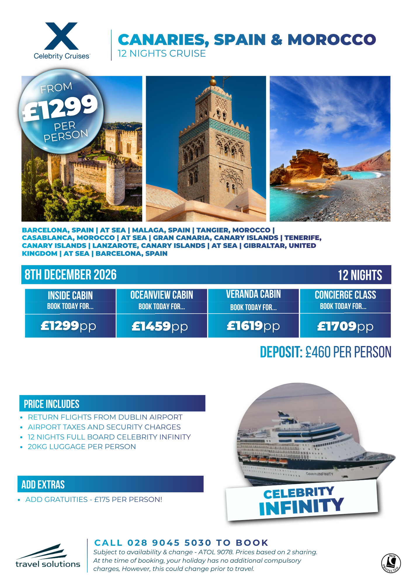 Please note, all cruise offers we advertise below are subject to availability & change and are ATOL 9078 protected. For latest availability/pricing, we recommend you call our Customer Care Team on 028 9045 5030.