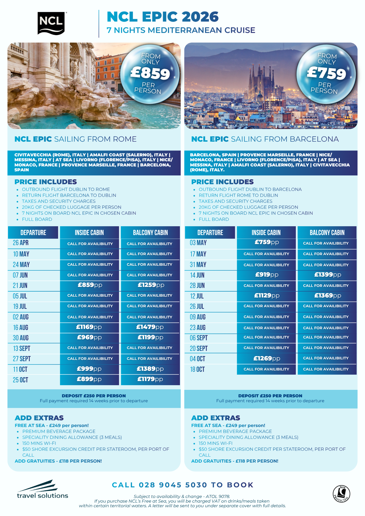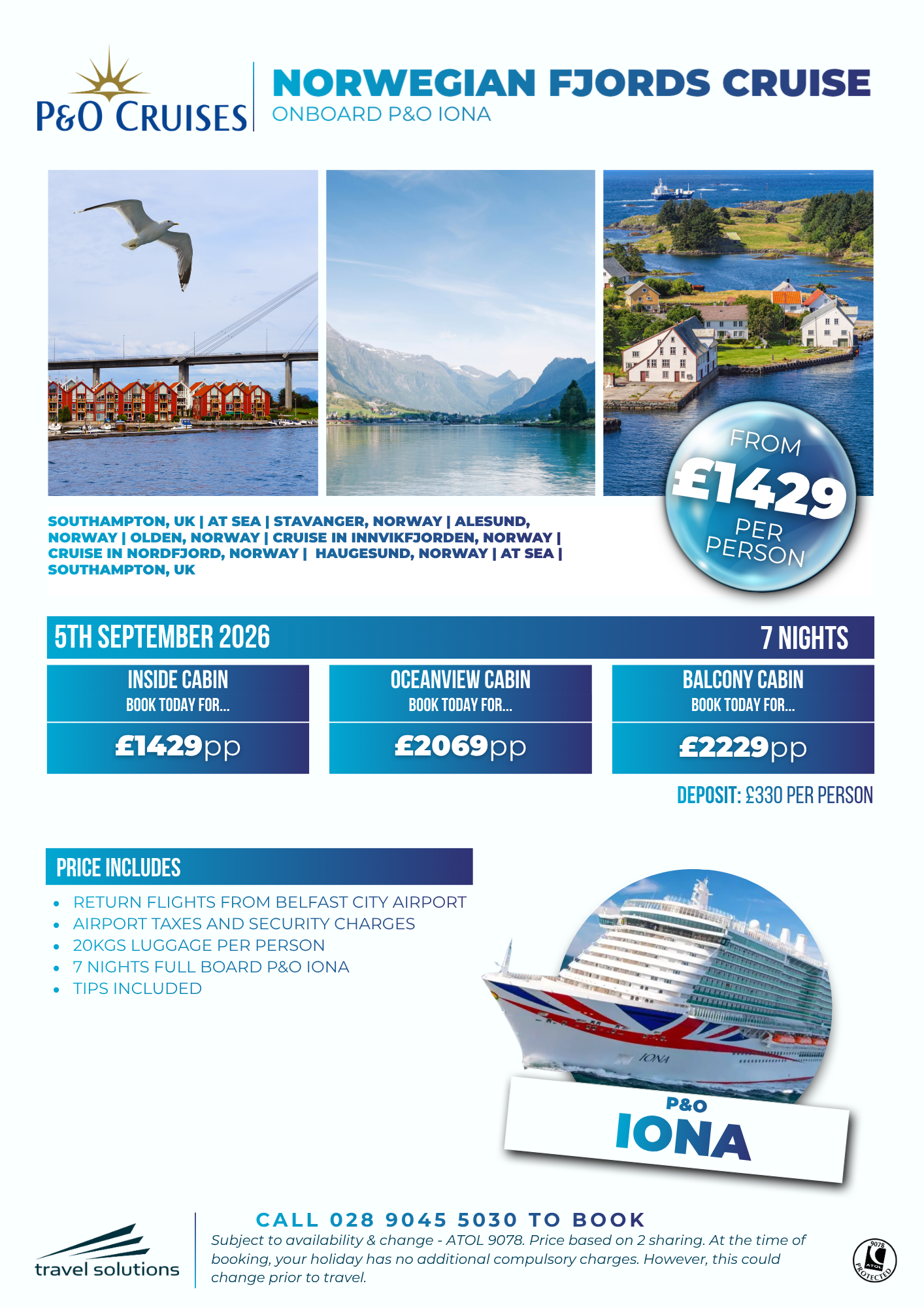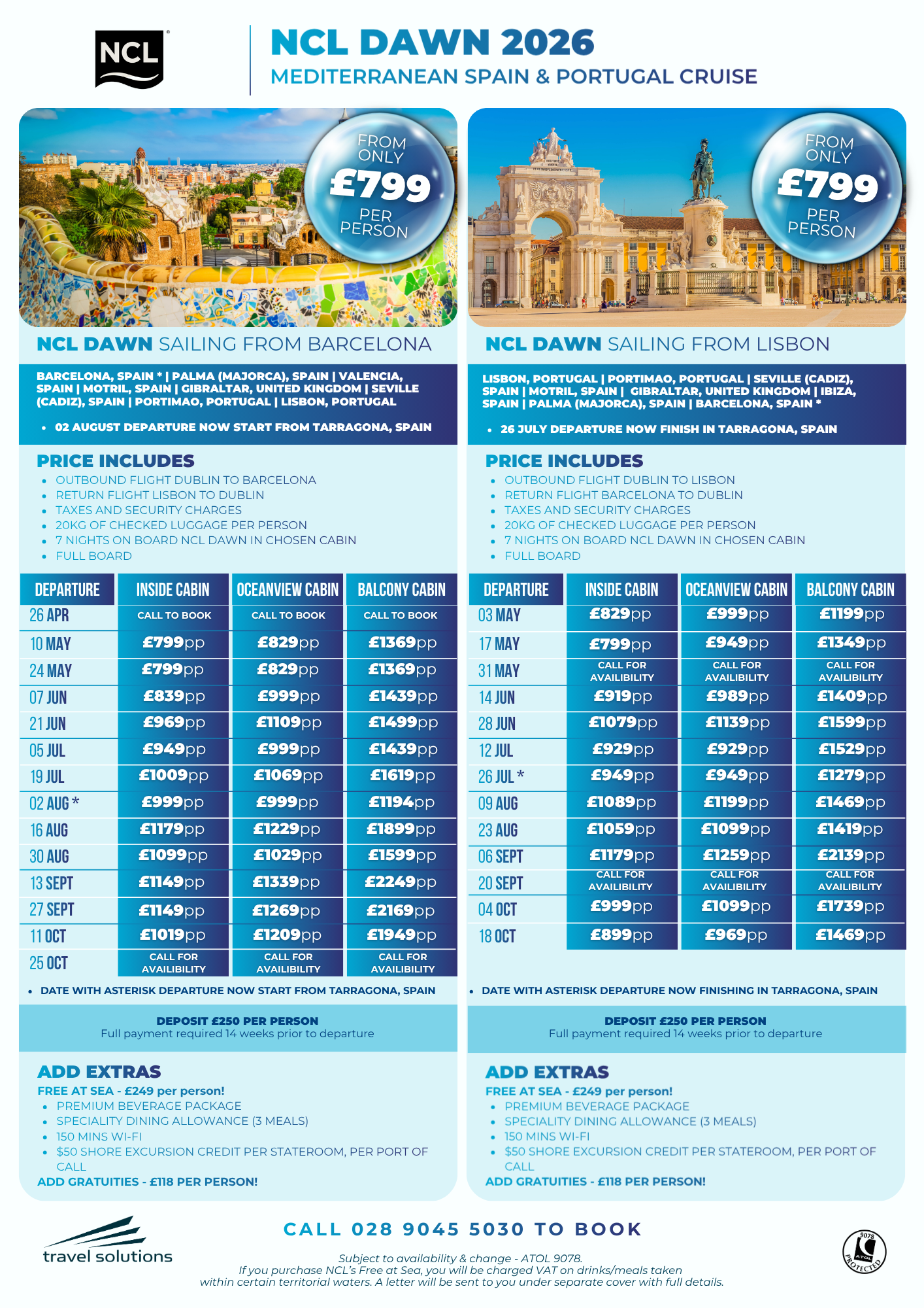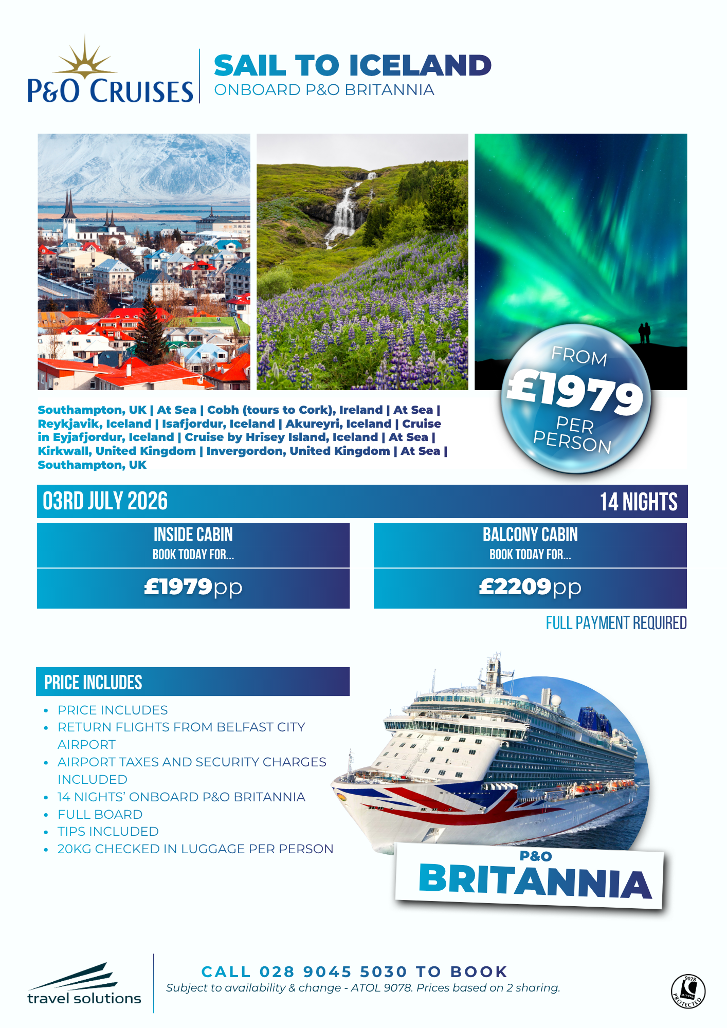 Please note, all cruise offers we advertise below are subject to availability & change and are ATOL 9078 protected. For latest availability/pricing, we recommend you call our Customer Care Team on 028 9045 5030.