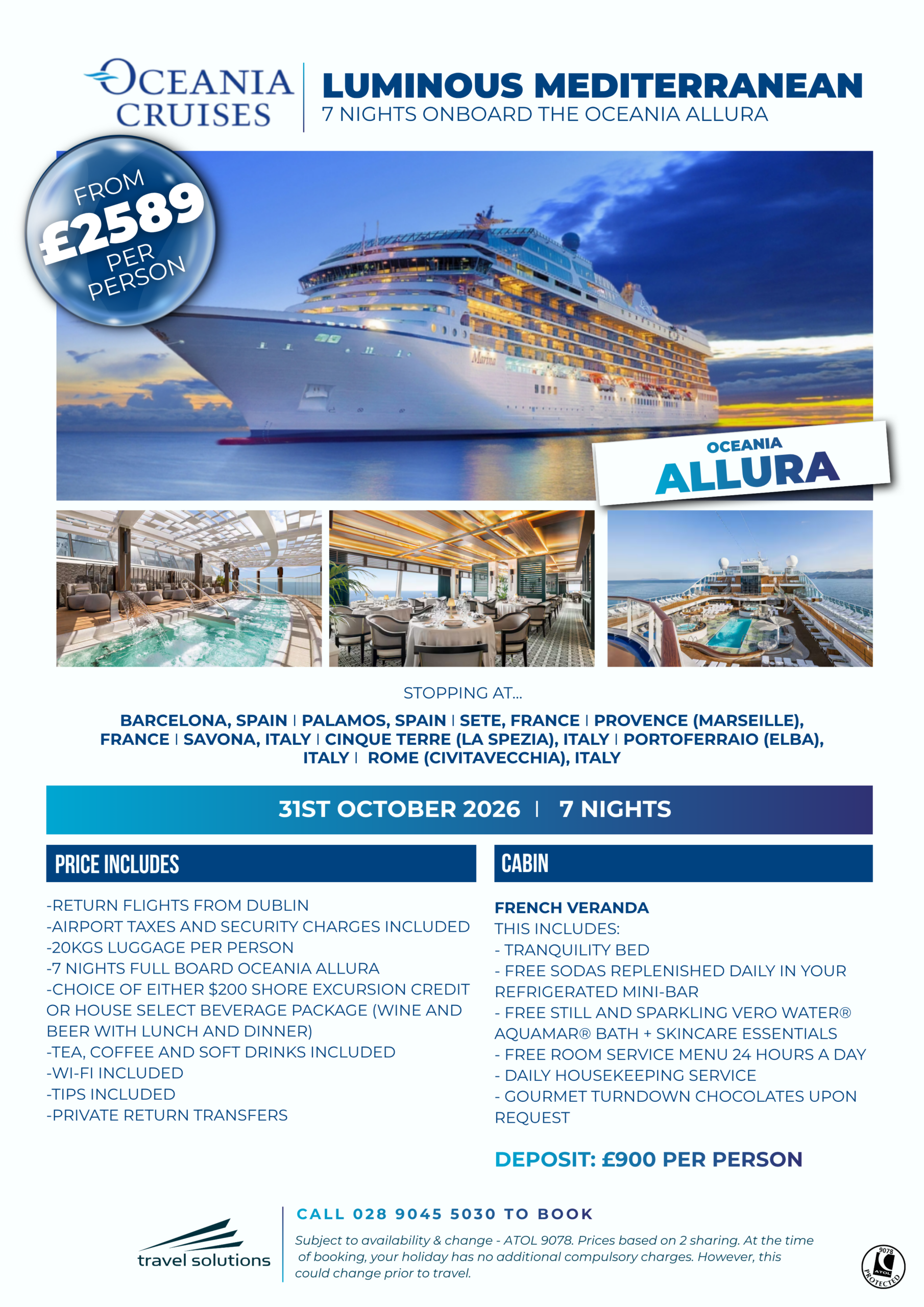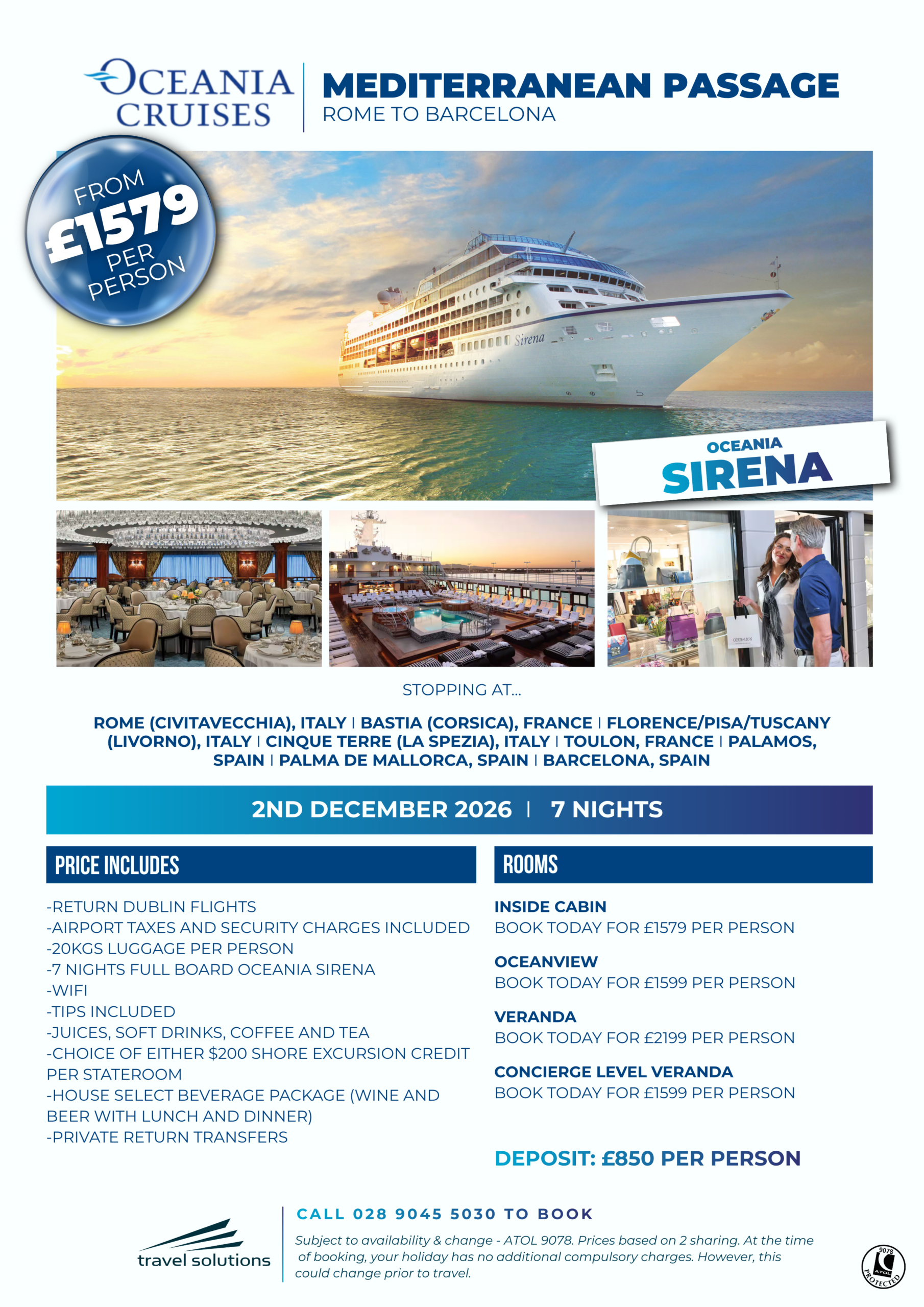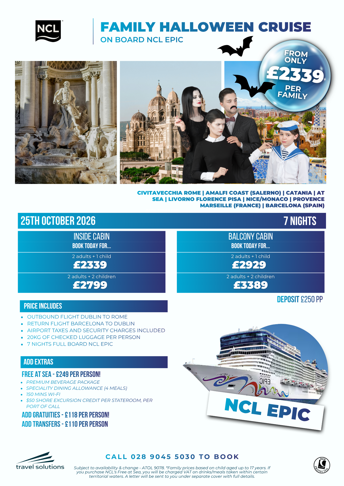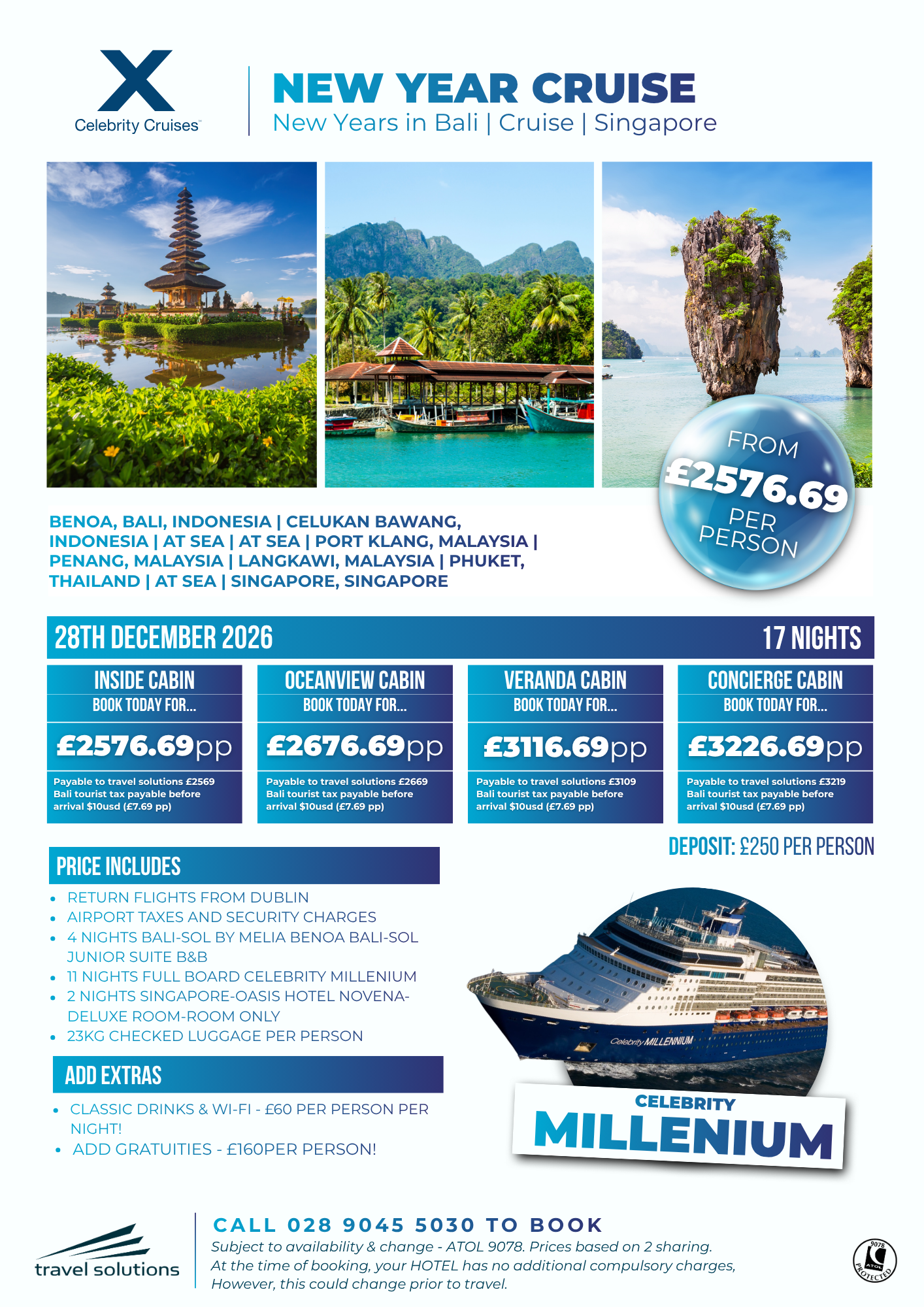 Please note, all cruise offers we advertise below are subject to availability & change and are ATOL 9078 protected. For latest availability/pricing, we recommend you call our Customer Care Team on 028 9045 5030.