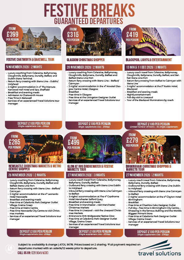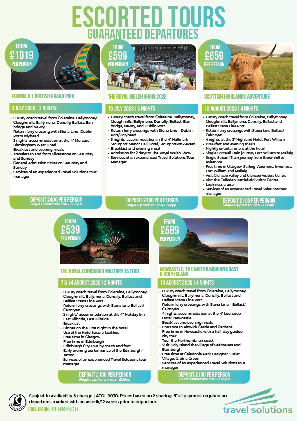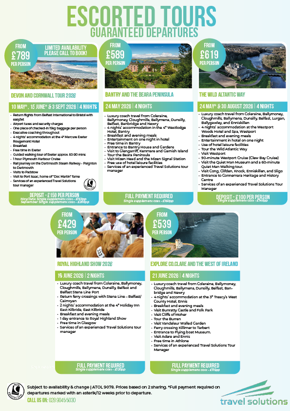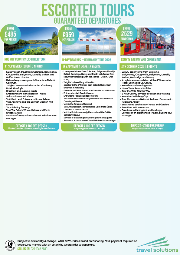With convenient local pick-up points across Northern Ireland, including Coleraine, Ballymoney, Ballymena, Belfast, Banbridge and Newry, starting your holiday couldn’t be easier. Plus, you’ll be travelling with like-minded people, making it a wonderful opportunity to share experiences, make new friends, and create lasting memories.
