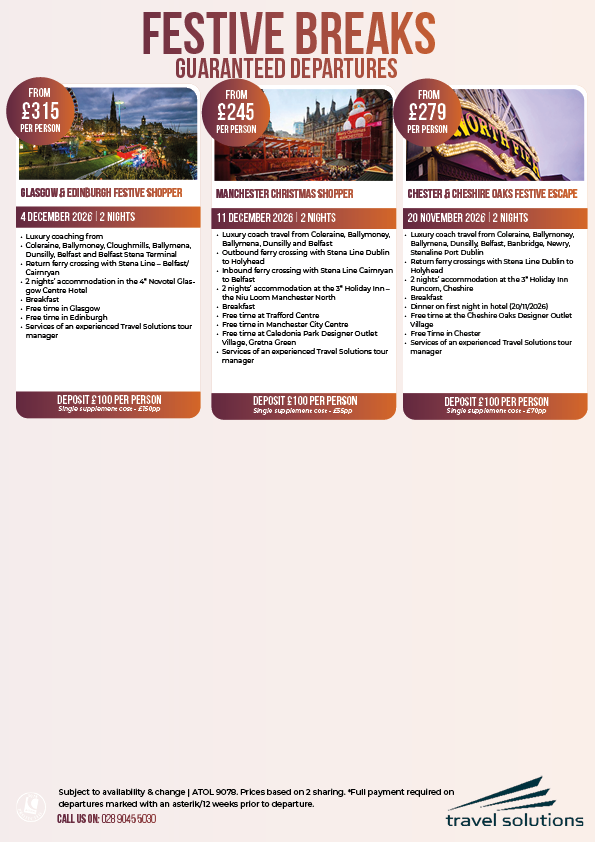 Please call reservations on 028 9045 5030 to book. Subject to availability & change – ATOL 9078.