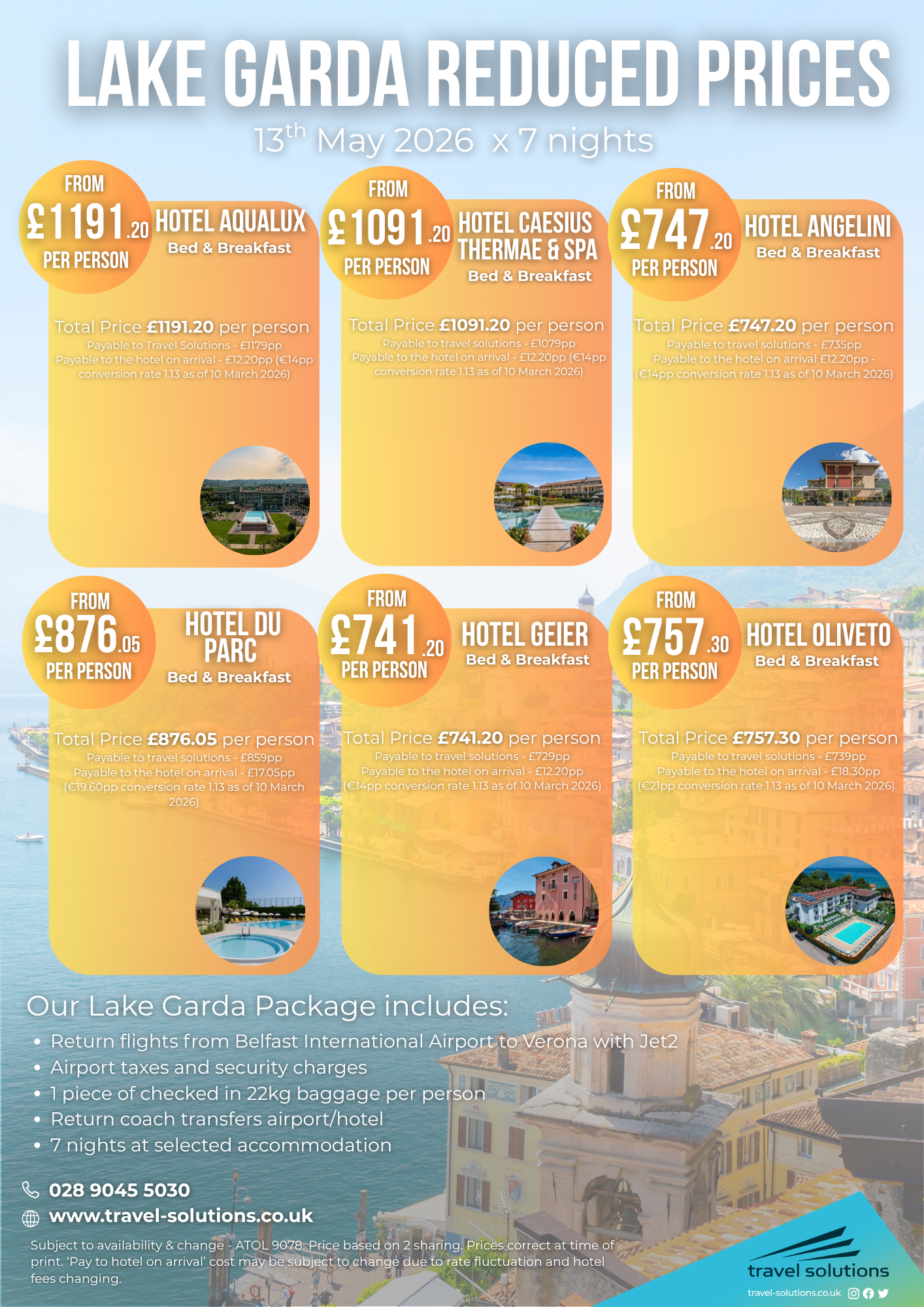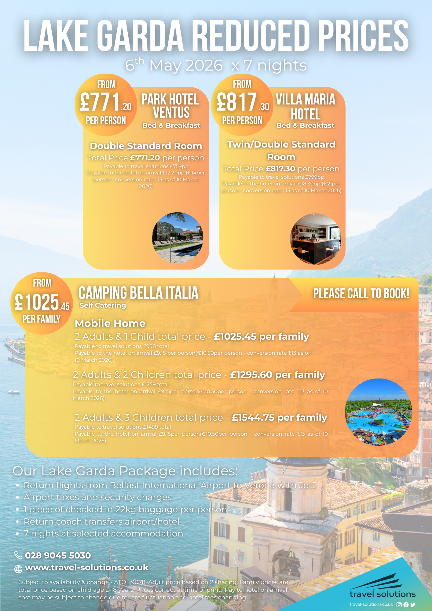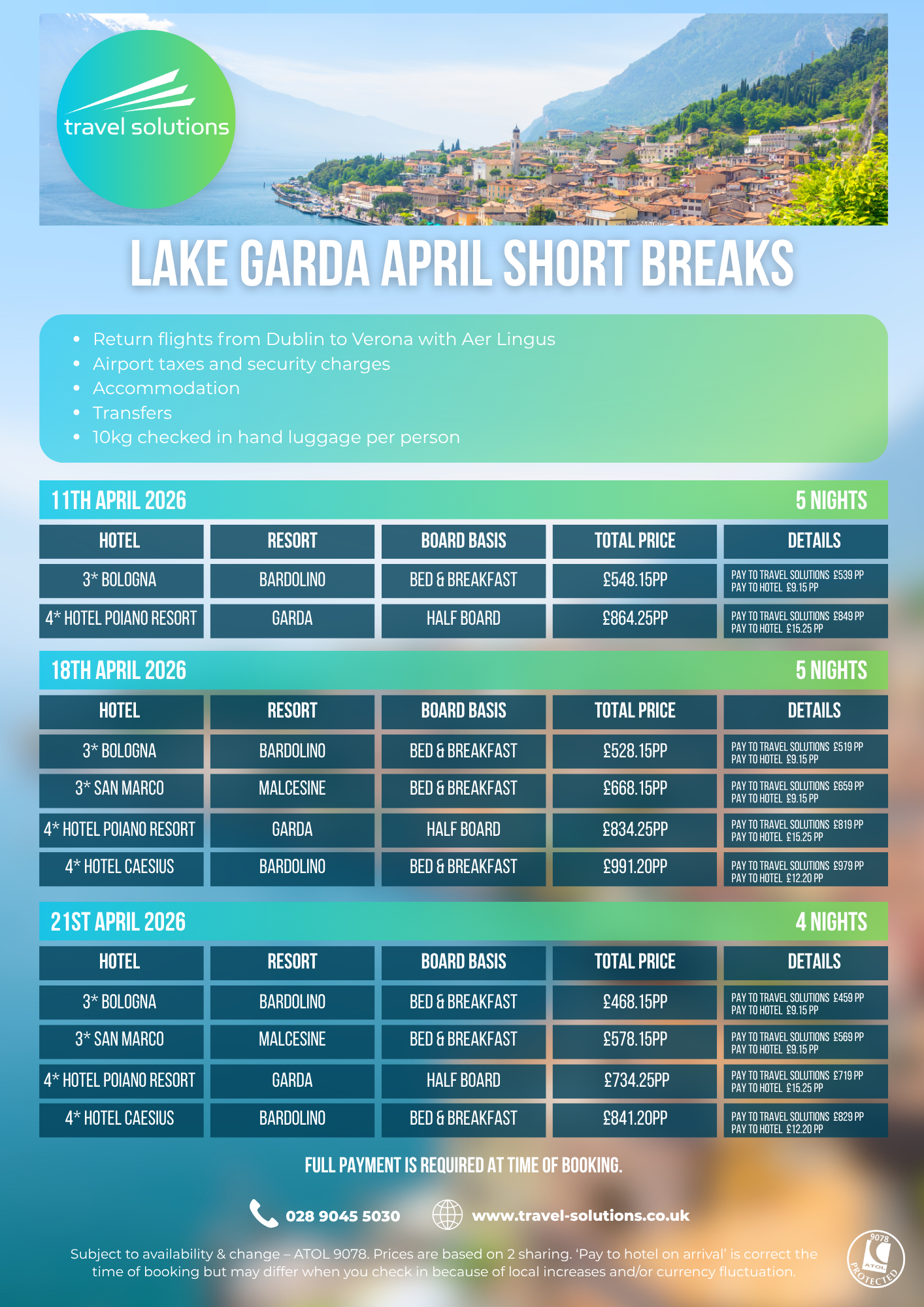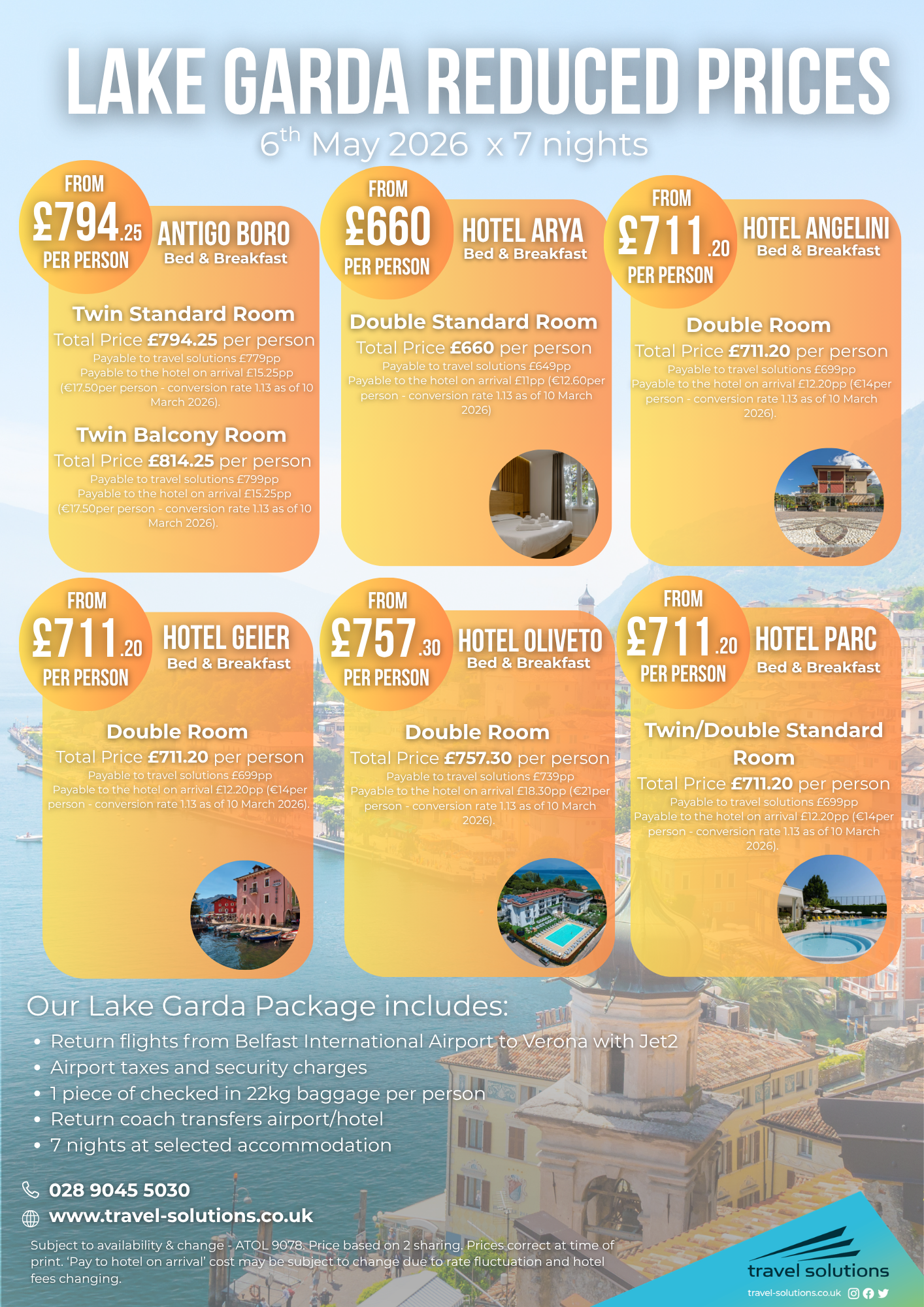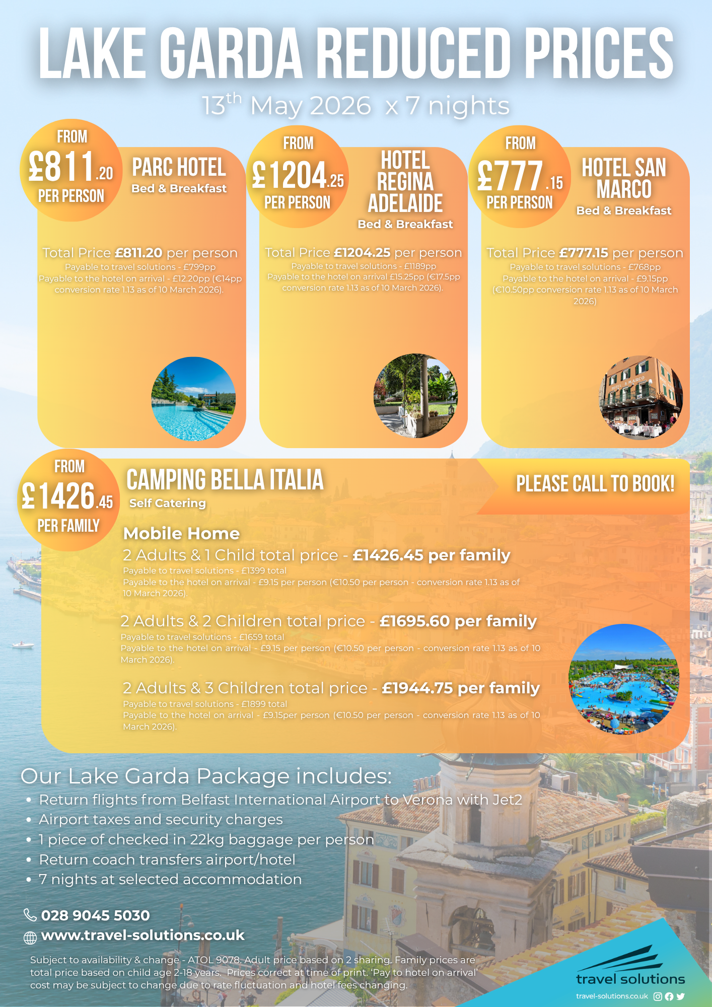 Departures available. Please call us on 028 9045 5030 or e-mail enquiries@travel-solutions.co.uk to enquire.