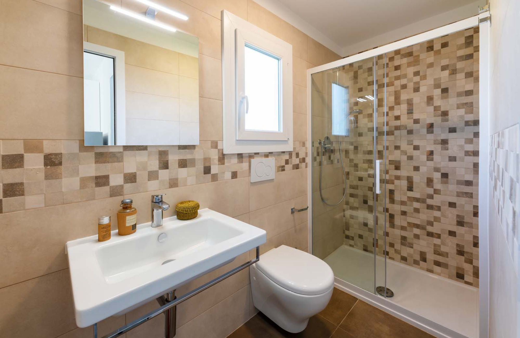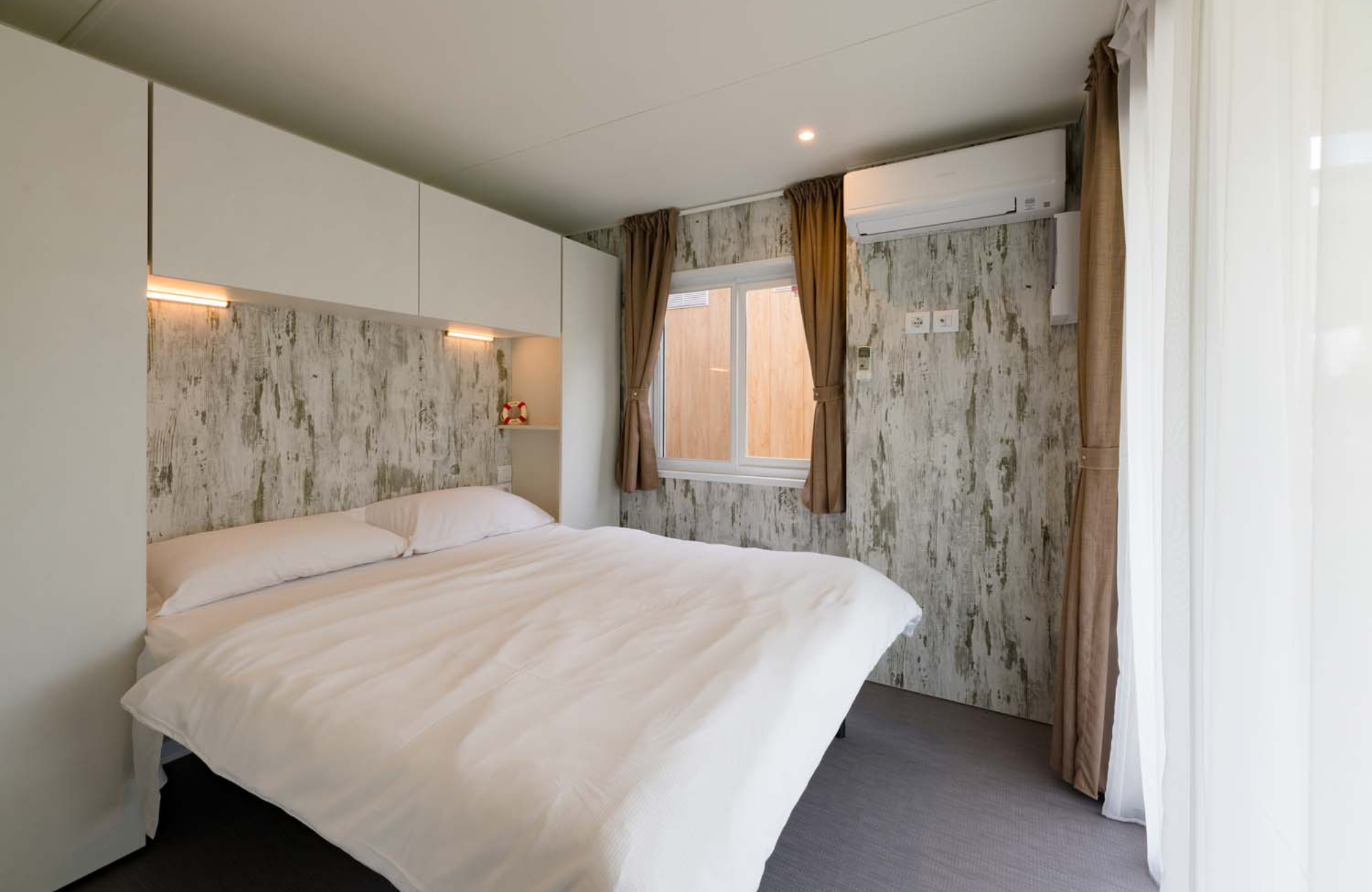 - 32 sqms- The MH Lodge Superior is located in the upper part of the campsite, not far from the swimming pool and in a quiet pedestrian area with a balcony view. Suitable for those who want to combine the freedom of a camping holiday with all the comforts of a hotel room. Completely “made in Italy”, custom built and with attention to the smallest details, they have finishes that recall those of civilian homes, such as the porcelain stoneware floors, the bathrooms with ceramic tiles and the walls with high thermo-acoustic insulation covered with washable plaster. They are equipped with every comfort and have a bathroom, kitchenette with induction hob and fridge, satellite TV,internet, phone, air conditioning/heating, safe, parking space. On the external veranda, equipped with table, chairs and cot, it is possible to enjoy relaxation surrounded by nature. They can accommodate up to 5 people as they are made up of a double bedroom with a large window that looks directly onto the external veranda and a bedroom with 2 single beds with an additional single bed against the wall. Sheets and towels are for hire. Inside there are already blankets and pillows. Pets are allowed inside.