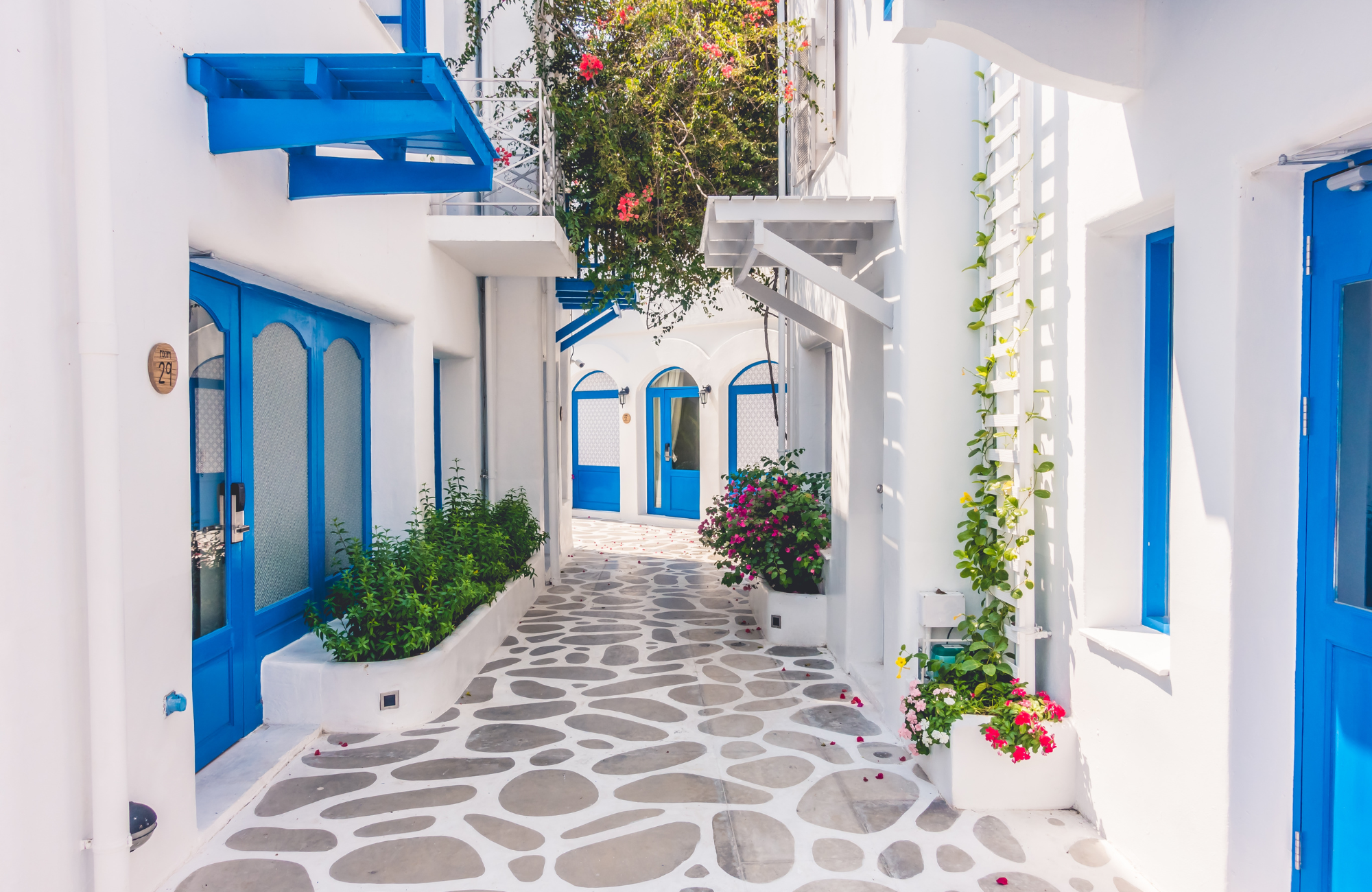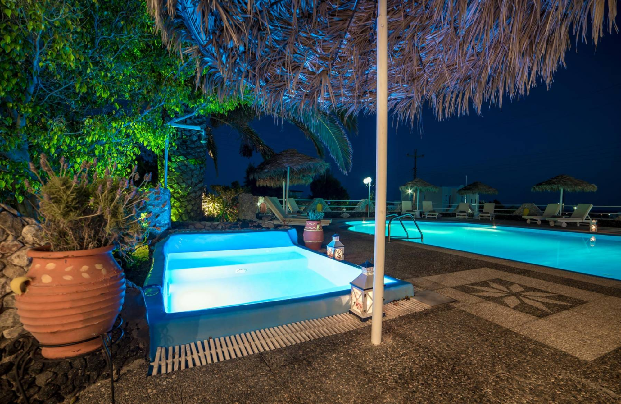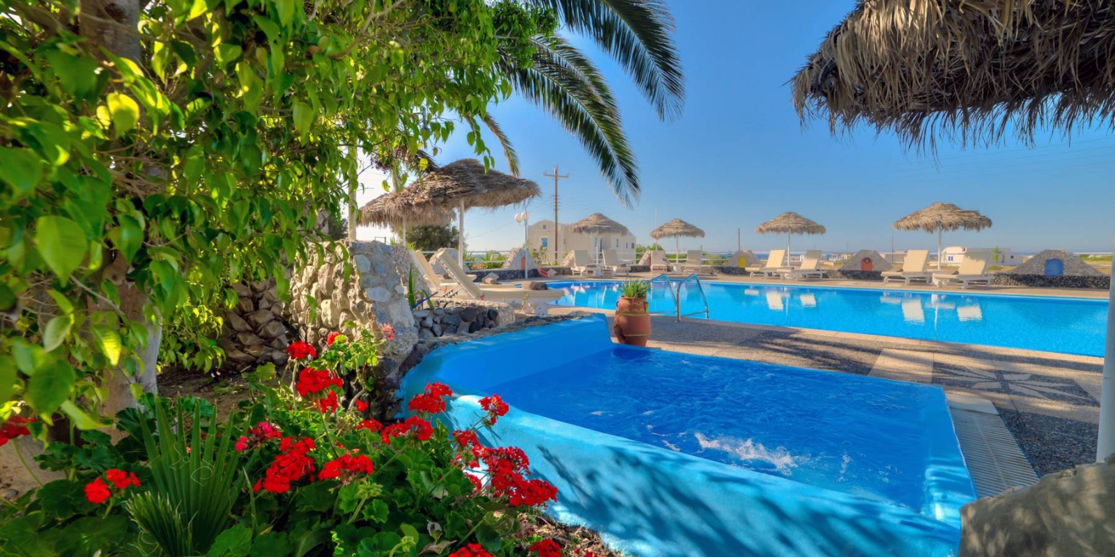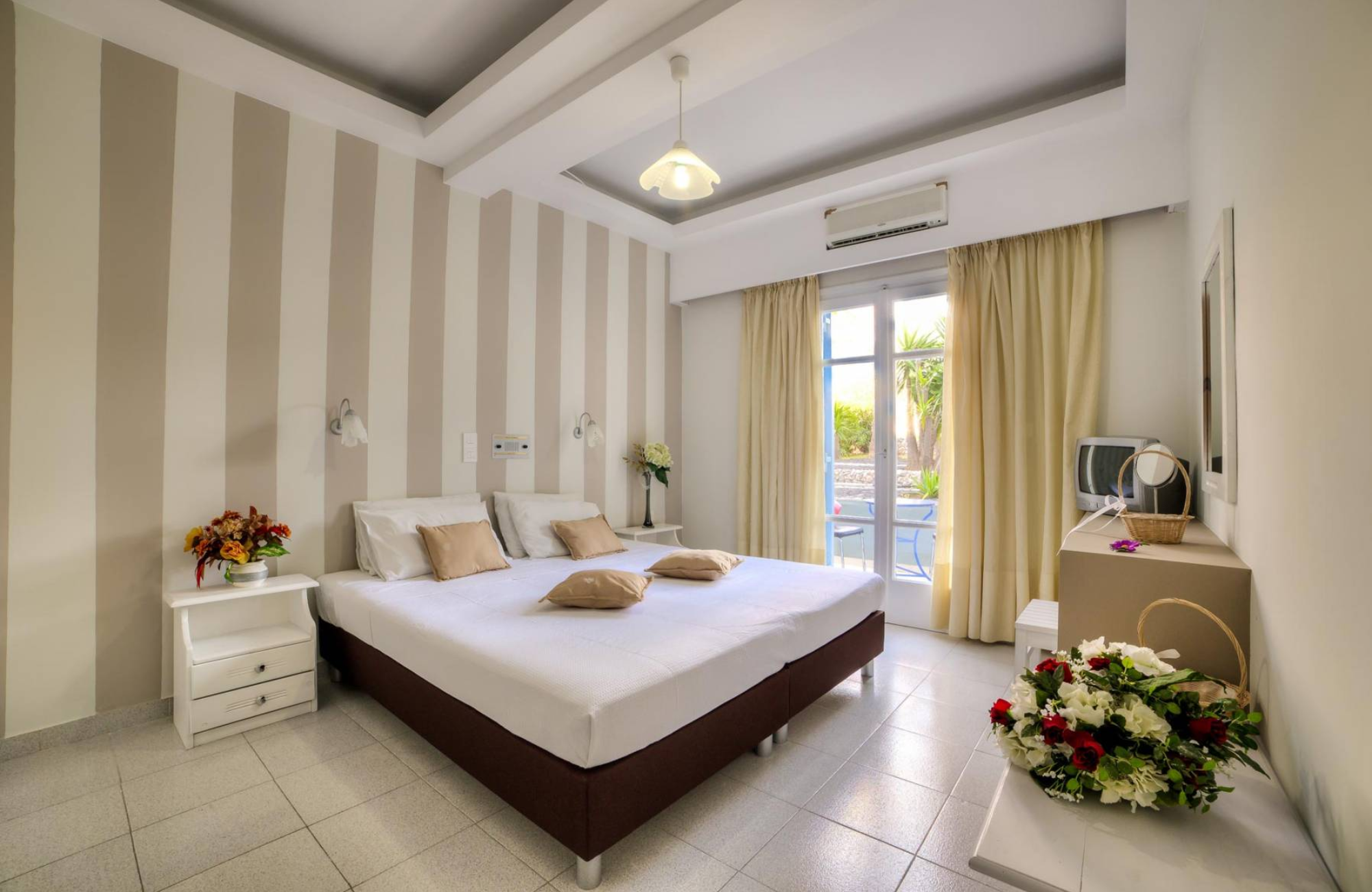 Pantheon Hotel is nestled in a tranquil area of Perivolos with lush green gardens. It’s a short 4-minute walk from the bus stop and mini market on the highway, and just 10 minutes on foot from the famous black beach. Here, you can enjoy traditional taverns, restaurants, beach bars, and water sports, making it a perfect spot for a dreamy holiday.