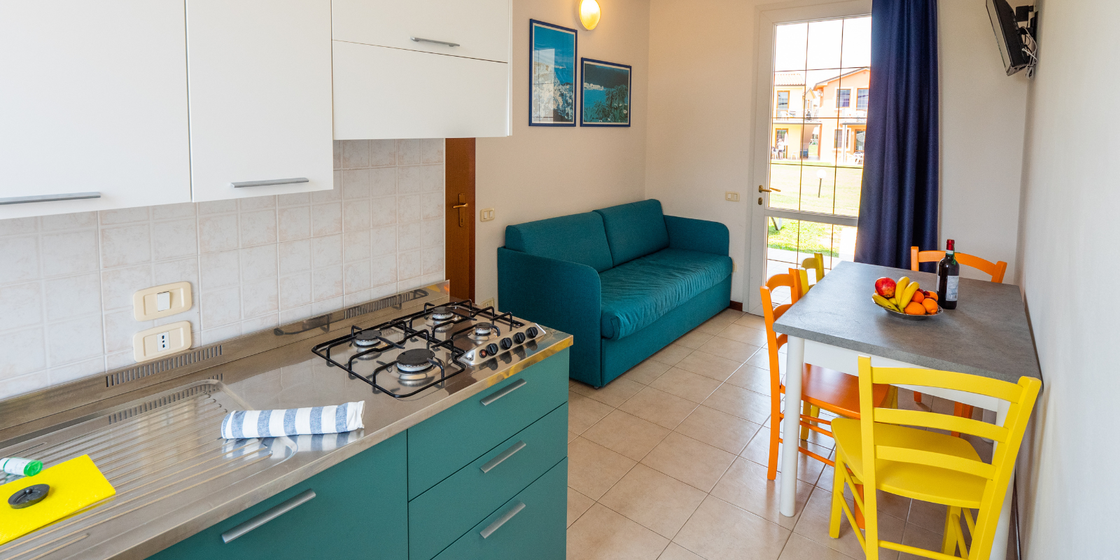 - Kitchenette with gas cooker, 4 burners, sink and fridge with ice compartment, table and six chairs